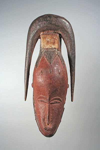 This mask is remarkable for its sweeping form, in which every part of the face answers to the line of the hair. A traditional hairstyle is depicted, with all the hair gathered up into a broad leather band from which it falls in two long, tapering plaits, often mistaken for horns. The eyes are horizontal and do not slant upward, as in the distinctive style developped by the master carver identified as "Master of Zuenola" and, more recently, "Master of the Bron-Guro."