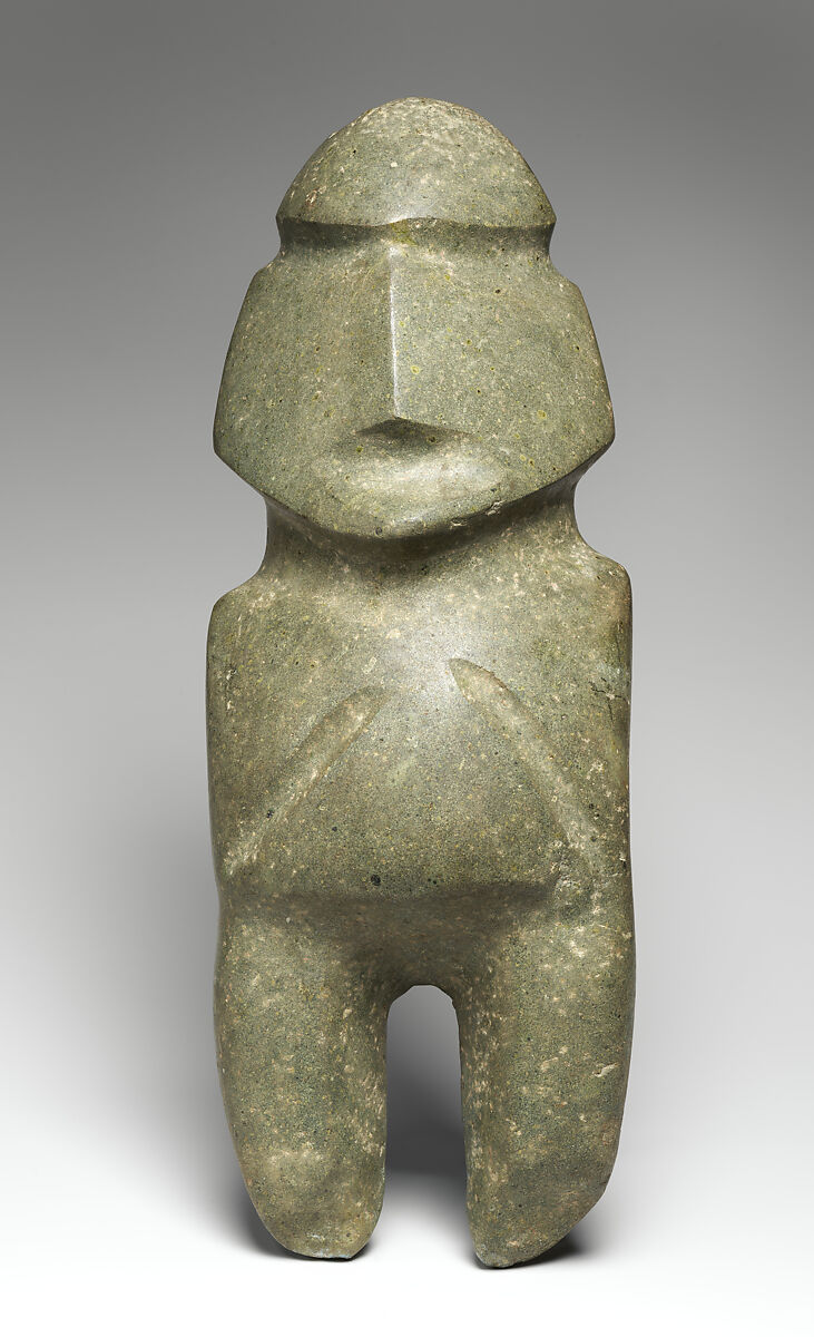 While most artists working in western Mexico created colorful ceramic figures, drawing their inspiration from lively community events and the natural world around them, artworks in the Mezcala style exhibit a highly stylized and conceptual approach to sculpture in stone. Architectural models suggest rather than depict buildings, and greatly simplified renderings of the human form like this one give no indication of either gender or hierarchy. Although the figure is nude, there is no representation of breasts or genitalia to indicate sex. Without the usual signs of social status, such as dress, jewelry, or body modification, the resulting image is simply and directly human. Miniature versions of figures like this are found on some Mezcala architectural models (see MMA 1994.35.633, 646). Shown standing or lying down, they may represent priests or sacrificial victims, thus transforming abstract renderings of place into narrative scenes of undefined ritual events.
