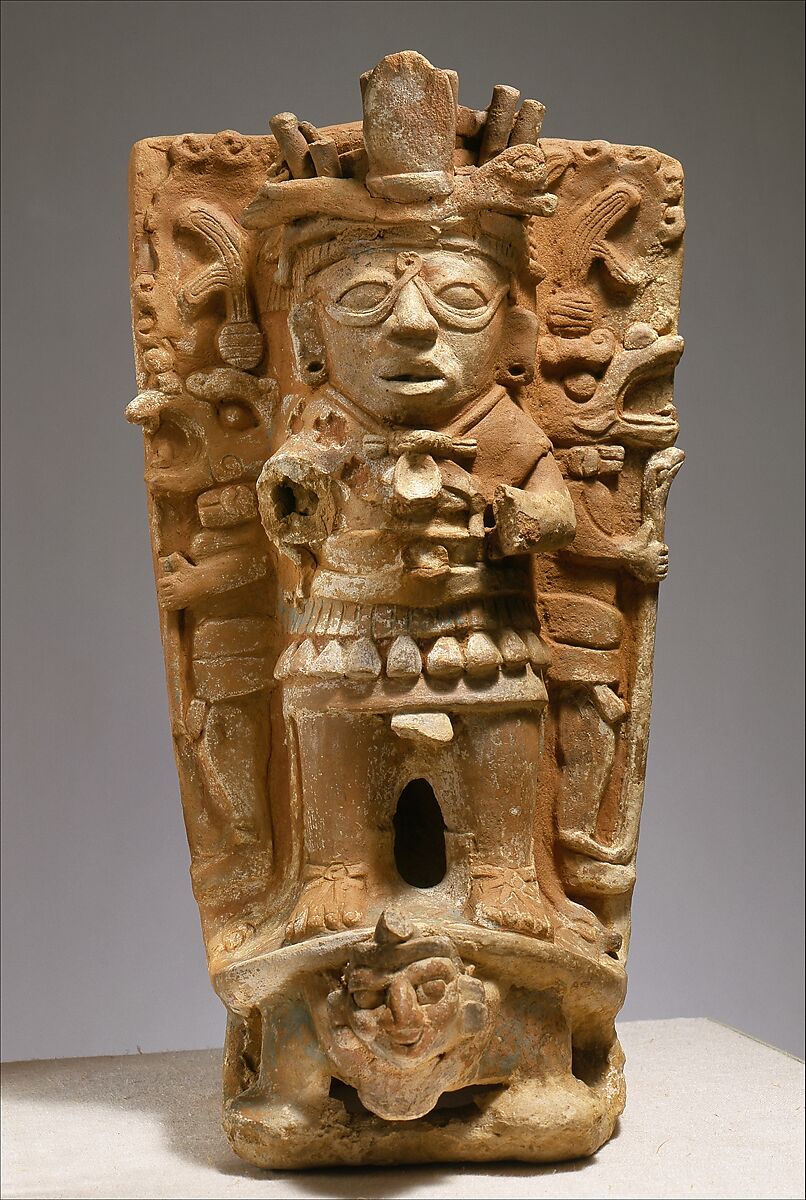 This hand-modeled flanged ceramic cylinder would have supported a bowl for the burning of incense for ritual purposes. A high-relief standing figure with a looped motif between his eyes, which is thought to relate to the Maya god of the sun, is depicted on the front. The figure is flanked by two smaller staff-bearing, animal-masked figures shown in profile. All three figures are positioned atop the carapace of a turtle out of the front of which emerges a human head, probably a representation of a Maya underworld deity. Turtle shells were regarded as metaphors for the earth, their openings viewed as analogous to those of caves. The combination of sun and underworld references suggests a cosmogram of the supernatural realm.