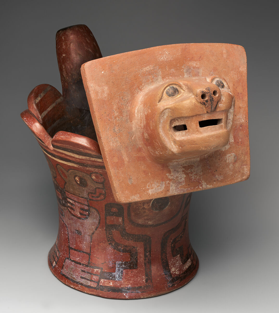 The ceramic vessels of highland Tiwanaku are sturdy and clean lined, with a no-nonsense approach to shape that sets them apart from the sculptural ceramic traditions of the coastal regions to the north. Surface color too is restrained, with a pre-dominance of earth tones in a limited range of hue. This flaring-side vessel is a typical, but distinctive, Tiwanaku type. It has a large feline head on one side and a stumpy, erect tail on the other. The head is surrounded by a large flange on which remnants of a design appear. Winged profile felines are on each side of the vessel. These big-footed cats abundantly fill the space allotted to them. Their eyes are round and divided in half with one half white and the other black, a stylization that was widely used on feline images.