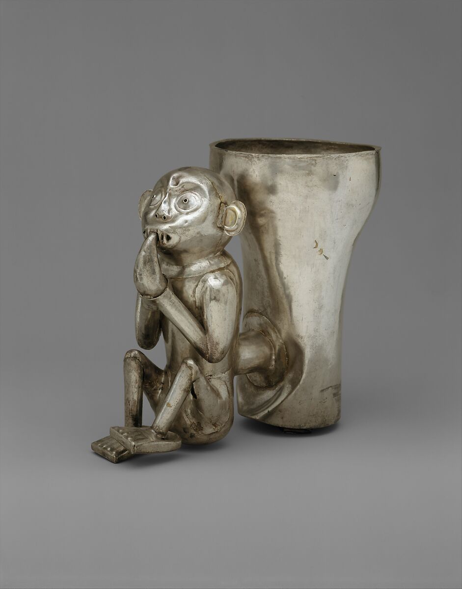 Elaborate and refined vessels of gold and silver were produced in the last centuries before the rise of the Inca Empire by metalsmiths in the kingdoms of Peru’s north coast. Most likely made to hold chicha, a maize beer, drinking such beverages was at the heart of ceremonial activities in the ancient Andes. This example is composed of two parts: a plain, round-shouldered beaker connected by a cylindrical tube to a figure in the shape of a seated monkey with legs drawn up and holding a fruit to its mouth. Created from twenty-four pieces of silver sheet of uniform thickness joined together both mechanically and with solder, the vessel is hollow throughout (see x-ray image below). This meant that when liquid was poured in and out of it, air would be forced out through a sphere inside the head, creating a whistle. The sound would emanate from holes pierced in the monkey’s mouth, nose, and eyes. Thus, as the vessel’s liquid contents were tilted to imbibe, and then set back down, the air in the vessel would be displaced, and the monkey would appear to make a noise.