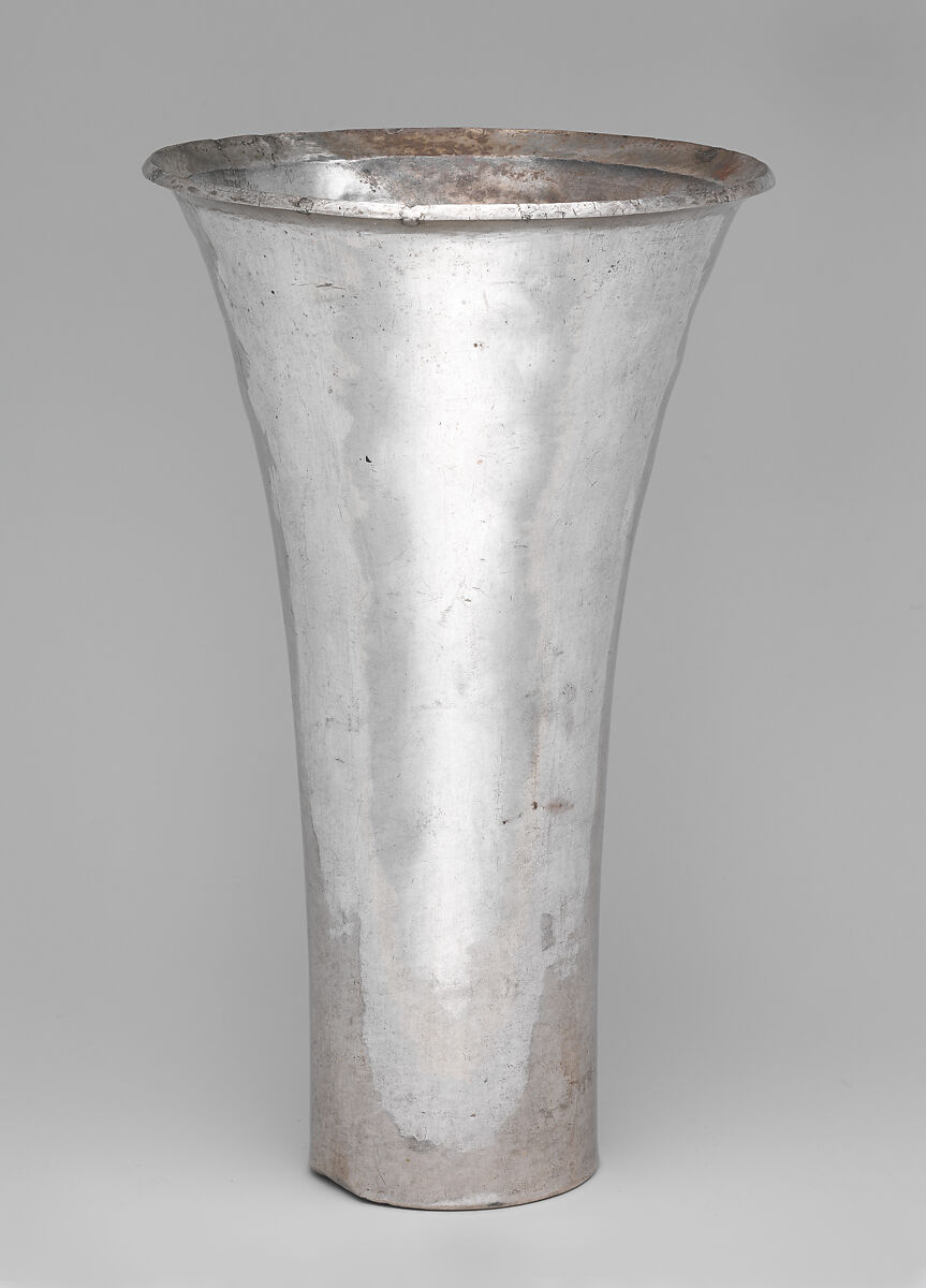 Unlike gold, which was available as nuggets and flakes in alluvial deposits and worked by metal artists of Peru’s North Coast since at least the first millennium BCE, working silver was a more complex process. Silver had to be sourced in veins in the highlands and then smelted (separated from other minerals) and refined. Chimú metalsmiths mastered the necessary technologies and brought silver working to new heights after 1000 CE. Silver was used to create items of personal adornment, but it was especially popular for drinking and serving vessels such as this tall flaring beaker, elegant in its minimalist simplicity.