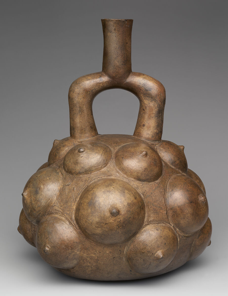 Cupisnique artists preferred a muted palette, usually the color of the fired clay itself, but they often tried to recreate tactile experiences in their ceramic sculptures. This bottle, for example, was inspired by the globose fruits of the lúcuma (Pouteria lucuma), a tree that thrives in the dry environs of the Peruvian coastal and highland valleys. The golden colored flesh of the lúcuma has a flavor described as resembling butterscotch, maple syrup, or sweet potatoes. Lúcumas are still eaten and used for flavoring in Peru and dried and frozen lúcuma preparations are available in specialty markets in the U.S. The composition of this bottle, featuring multiple fruits with their spiky ends bulging out, was likely inspired by how these fruits look when carried inside a mesh bag.