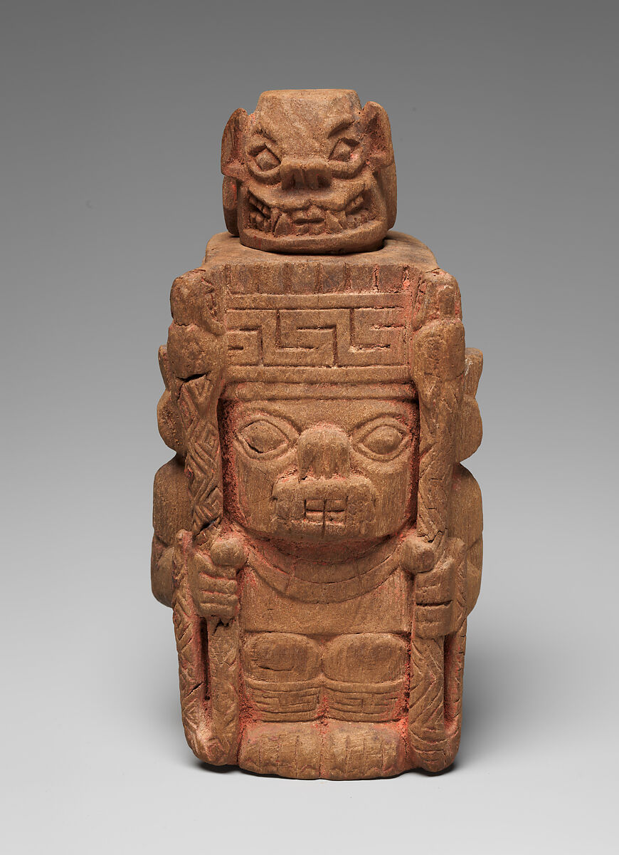 This intricately carved seated wooden figure with human, feline and avian features originally served as a container for a paste of powdered lime (calcium oxide) used when chewing coca leaves. The figure has canine-like teeth and a button nose. It wears a short tunic as well as ornaments around the ankles with a geometric design often referred to as a meander, which is repeated in his hat. The creature holds a snake with a fanged mouth in each hand, and patterned wings sweep back from behind each arm. The back of the container is carved to form a bundle of what may represent spears. On top of the head rests a small, fanged head that is the end of a spoon that extends into the hollow interior and was used to remove the paste. Traces of red pigment are visible on the surface.