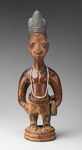 Yoruba peoples have one of the highest incidents of twin births in the world. As a result, twins are regarded as extraordinary beings protected by Sango, the deity of thunder. They are believed to be capable of bestowing immense wealth upon their families or misfortune to those who do not honor them. Powerful spirits in life, twins are honored with carved memorial figures when they die. These figures, known as ere ibeji (literally meaning ere: sacred image; ibi: born; eji: two), remain a point of access to the spirit of the departed individual. The mother provides ritual care to the figures, bathing, dressing, adorning, and feeding them. Such daily handling is responsible for giving their surface its distinctive patina. Ere ibeji invariably represent their subjects with mature adult physiognomies, and are often crowned with elaborate hairdos.