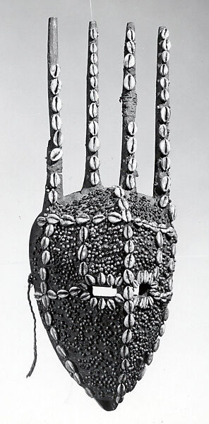 Cowrie shells and seeds now cover the face and four vertical spikes of this Ntomo mask. When the Museum of Primitive Art (MPA) displayed the mask in its 1960 exhibition, "Antelopes and Queens: Bambara Sculpture from the Western Sudan," it had a barer surface. New York-based dealer J. J. Klejman’s November 25, 1959 invoice describes the mask as "a zoomorphic mask with four protruding vertical horns. Surface is covered with heavy, resinous patina in which seeds are embedded." In a separate November 1959 memo to Rockefeller, Museum of Primitive Art director Robert Goldwater includes the mask in a list of four "outstanding Bambara [Bamana] objects." In October 1969, the MPA added many of the shells and seeds on the mask. A note describing the treatment explains, "gen[era]l pattern indicated by orig[inal] markings and indentations followed in patterns."