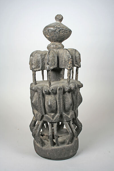 While the purpose for which this sculpture was created is not entirely clear, its richly textured surface suggests a devotional setting involving repeated applications of offerings and libations. Composed of a set of eight female figures arrayed around a central core and crowned by a top-like form, this work may have once adorned a shrine or altar created for communication with the ancestors of a Dogon lineage group or other divine powers.