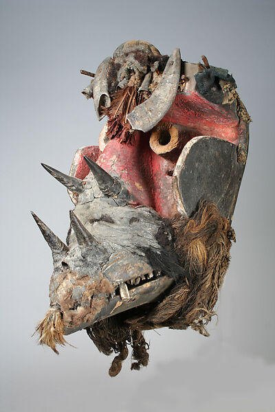 With projecting horns and menacing jaws, this intimidating form likely served as a téhé or tu vohn (warrior) mask. Such creations are performed as forces of public order and justice in Wè communities. Worn only by the most courageous young men, téhé glaè preside over mask festivals to ensure their efficacy in bringing wealth and prosperity to the community. Their choreography requires constant vigilance and stamina, involving full days of running across the village, as well as throwing stones at and striking with a broom or whip those who interfere with the masquerade activities.