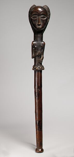 This scepter was once part of a treasury of royal prestige items owned by an Ovimbundu chief in what is today north-central Angola. A finely carved and highly polished female head and torso comprise nearly one-half of its length. Elegant and refined, this idealized woman represents positive qualities the leader would wish to cultivate within himself. Careful attention has been paid to the accurate depiction of the elaborate coiffure, which is composed of two thick lobes swept backwards down the neck, and to the decorative markings on the skin. These bodily adornments, many of which would be received during an individual's transition into adulthood, were indications of social achievement and cultural integration. The figure's meditative expression, composed of downcast eyes and pursed mouth, combine with a bulging forehead to suggest intelligence and insight as well as deliberation and purpose. Decorative brass tacks embellish the base of the torso. Brass was an expensive, imported material that was drawn upon to enhance prestige items in this region. It served not only to beautify these sculptures and increase their value but also to indicate their owners' successful trading relationships with foreign powers.