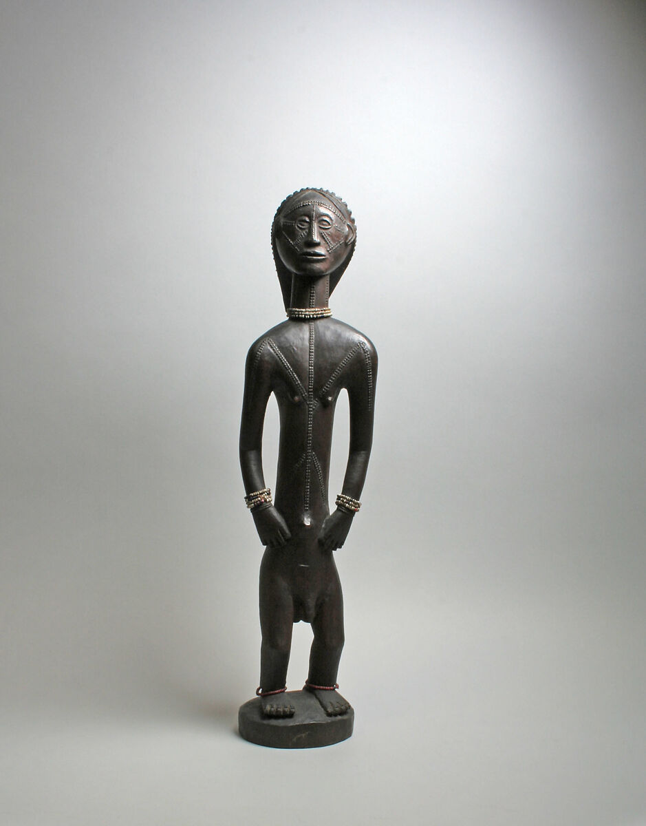 These Tabwa figures, like most other works of this genre, are nude except for strands of beads around their necks, wrists, ankles, and, on the female figure, the waist. Period sources tell us that Tabwa individuals generally wore very few articles of clothing, but that beaded belts were commonly worn by both men and women, and acted as markers of kinship. When an elder died, his or her belt was passed down to a younger relative, maintaining ancestral continuity and family identity. In the context of these sculptures, such belts were vital signs of lineage that reinforced links to previous generations of rulers.