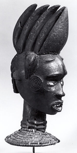 The headdresses, which bear the same name as the society that owns them, are worn during funerals and initiations. Some are startlingly naturalistic and may be portraits of known individuals; others are highly stylized. To make a headdress, the artist carves the form from a single piece of wood and covers it with soft un-tanned antelope skin that has been soaked in water for several days. He stretches, binds, and pegs the skin into place until it dries and stiffens. Eyes, scarifications, and hair are often carved separately and pegged into the finished piece. Before it is worn, the headdress is painted or colored, then adorned with porcupine quills, feathers, or feathered rods stuck into holes at the top.