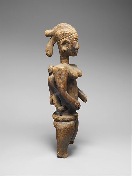 This maternity figure once served as an instrument in the diagnosis and treatment of illness by the Kwompten healing society. Its formal balancing of shelflike hips, squared shoulders, and arms bent away from a columnar torso reflects the carver’s awareness of devotional sculptures created by neighboring Jukun and Mumuye artists. The softer naturalism and fine surface incisions of the mother’s face suggest the influence of Lower Benue and Yoruba sculptural traditions from farther south.