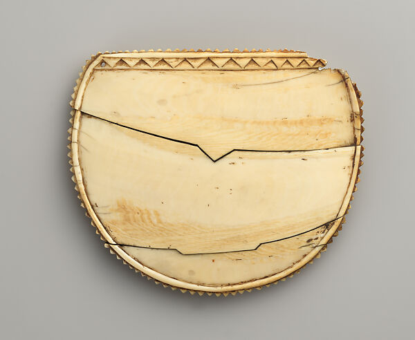 Worn exclusively by male chiefs, breastplates in the Fiji Islands were precious and powerful objects and a prestigious element of ceremonial attire. When worn into battle, they were said to make the wearer invulnerable to enemies. Breastplates were suspended from two cords tied together behind the wearer’s neck, while a third cord passed around the body to hold the ornament in place on the chest during battle and other strenuous activities. Although worn by Fijian chiefs, breastplates were created by Tongan and Samoan artists, who had begun to settle in Fiji by the late 1700s. The plates were fashioned primarily from whale ivory, a precious material often used in combination with pearl shell. The ivory elements on some examples resemble stars or crescent moons, but their precise significance is unknown.