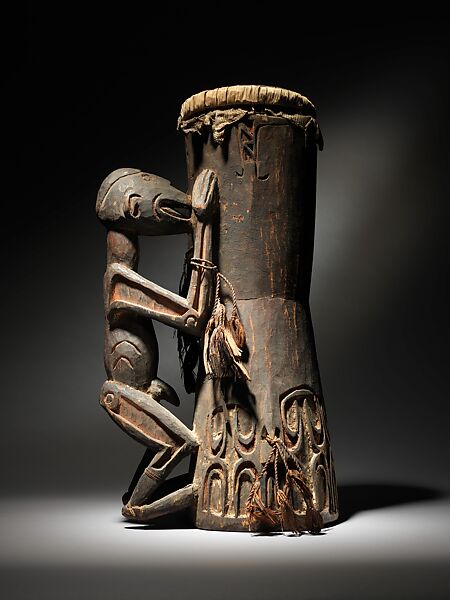 The only musical instruments used by the Asmat are drums, which are beaten in a regular rhythm to accompany songs that are part of all ceremonies and feasts. Lizard-skin tympanums (drum heads) are attached to the drums with an adhesive mixture of lime and human blood. Handles are elaborately carved, usually with images of relatives and the heads of parrots and cockatoos. The figure on this particular work probably represents the father of the owner. The designs on the base of the drum depict the shell-nose ornaments worn by Asmat warriors.