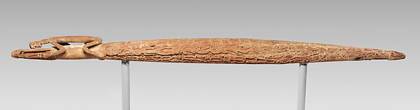 This horizontal ancestor pole depicts a stylized crocodile, its body covered with elaborate designs that include headhunting symbols. The head of the crocodile is surmounted by a small human figure depicting an ancestor. The form of the ancestor figure with its slender elongated body and bent limbs also refers to the shape of a praying mantis. Praying mantises, whose females sometimes bite off the heads of the males after mating, were potent symbols of headhunting, which was formerly practiced by the Asmat. The precise nature and significance of such crocodile-shaped ancestor poles are uncertain. However, they may have been used in ceremonial contexts similar to the larger bis poles. If so, like bis poles, they probably served both to commemorate the dead and, in the past, to remind the living that the deceased must be avenged through a retaliatory raid on the enemy