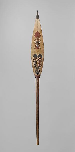 Buka is home to two main clans: Nakaripa represented by the Kua (bush fowl) totem, and Naboen represented by the Manu (eagle) totem. According to oral histories, the bush fowl cannot fly while the eagle can, so the Nakaripa own the land while the Naboen own the sky. The other two are sub-clans on Buka; the Nakas, whose totem is the Kinon (a dingo-like dog which is now extinct on Buka Island), and the Natasi, with the totem of Popoei (seafoam). And whilst the Nakas is largely affiliated with the Nakaripa clan, the Natasi is with the Naboen clan. Bougainville is largely a matrilineal society in which land is owned by women and chiefly titles pass through the female line; with the exception of South Bougainville which is patrilineal. The highest rank of chief is the Patu, a position that is considered equivalent to sacred beings. Nakaripa and Naboen each have a Tohe Kau Mal (female paramount chief) and her brother, the Tsunono Mal (male paramount high chief). The second in line to the chiefs fulfils the role of voice and knowledge holder, and acts as the bridge between the chiefs, clan members and the general public. The information about this paddle was provided to the Metropolitan Museum by curator Sana Reana Balai, voice of the Nakaripa kabe kabe golehe clan.