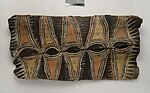 This panel is one of over 270 original paintings commissioned from Kwoma artists in the village of Mariwai in 1970 and 1973 by Douglas Newton, the first curator of Oceanic art in the Department of the Arts of Africa, Oceania and the Americas. Once completed, they were shipped to New York and installed in the galleries. In 2007, when the Oceania galleries at the Metropolitan Museum were renovated, the panels were attached to a new superstructure. Although less steeply pitched than the Kwoma houses found in villages today, the installation evokes the essential form of a ceremonial house ceiling. Together these suspended panels form an impressive and spectacular installation in the Metropolitan Museum which, at 80.4 feet (24.5 meters) end-to-end, is the largest contemporary art installation in the museum.