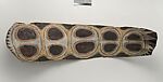 This panel is one of over 270 original paintings commissioned from Kwoma artists in the village of Mariwai in 1970 and 1973 by Douglas Newton, the first curator of Oceanic art in the Department of the Arts of Africa, Oceania and the Americas. Once completed, they were shipped to New York and installed in the galleries. In 2007, when the Oceania galleries at the Metropolitan Museum were renovated, the panels were attached to a new superstructure. Although less steeply pitched than the Kwoma houses found in villages today, the installation evokes the essential form of a ceremonial house ceiling. Together these suspended panels form an impressive and spectacular installation in the Metropolitan Museum which, at 80.4 feet (24.5 meters) end-to-end, is the largest contemporary art installation in the museum.