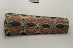 This panel is one of over 270 original paintings commissioned from Kwoma artists in the village of Mariwai in 1970 and 1973 by Douglas Newton, the first curator of Oceanic art in the Department of the Arts of Africa, Oceania and the Americas. Once completed, they were shipped to New York and installed in the galleries. In 2007, when the Oceania galleries at the Metropolitan Museum were renovated, the panels were attached to a new superstructure. Although less steeply pitched than the Kwoma houses found in villages today, the installation evokes the essential form of a ceremonial house ceiling. Together these suspended panels form an impressive and spectacular installation in the Metropolitan Museum which, at 80.4 feet (24.5 meters) end-to-end, is the largest contemporary art installation in the museum.