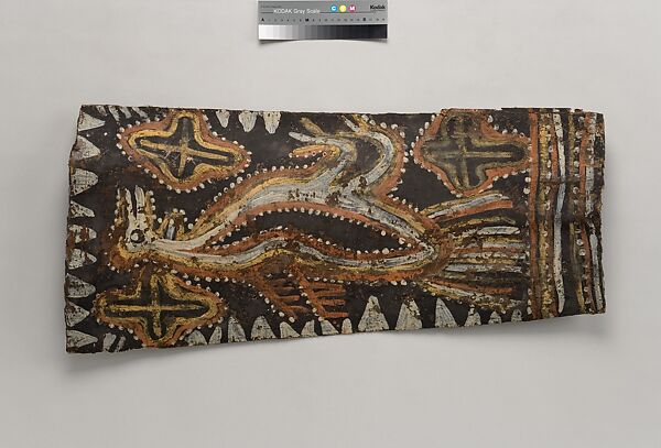This panel is one of over 270 original paintings commissioned from Kwoma artists in the village of Mariwai in 1970 and 1973 by Douglas Newton, the first curator of Oceanic art in the Department of the Arts of Africa, Oceania and the Americas. Once completed, they were shipped to New York and installed in the galleries. In 2007, when the Oceania galleries at the Metropolitan Museum were renovated, the panels were attached to a new superstructure. Although less steeply pitched than the Kwoma houses found in villages today, the installation evokes the essential form of a ceremonial house ceiling. Together these suspended panels form an impressive and spectacular installation in the Metropolitan Museum which, at 80.4 feet (24.5 meters) end-to-end, is the largest contemporary art installation in the museum.