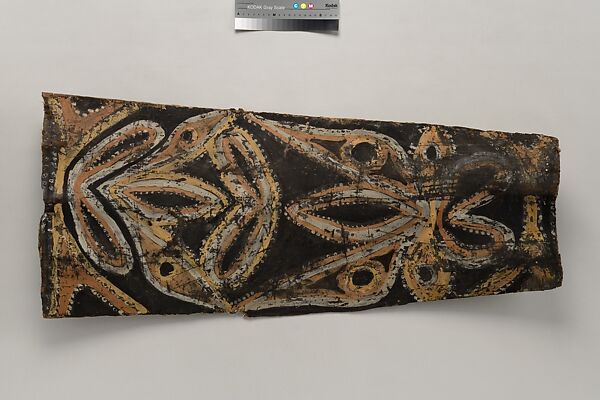 This panel is one of over 270 original paintings commissioned from Kwoma artists in the village of Mariwai in 1970 and 1973 by Douglas Newton, the first curator of Oceanic art in the Department of the Arts of Africa, Oceania and the Americas. Once completed, they were shipped to New York and installed in the galleries. In 2007, when the Oceania galleries at the Metropolitan Museum were renovated, the panels were attached to a new superstructure. Although less steeply pitched than the Kwoma houses found in villages today, the installation evokes the essential form of a ceremonial house ceiling. Together these suspended panels form an impressive and spectacular installation in the Metropolitan Museum which, at 80.4 feet (24.5 meters) end-to-end, is the largest contemporary art installation in the museum.
