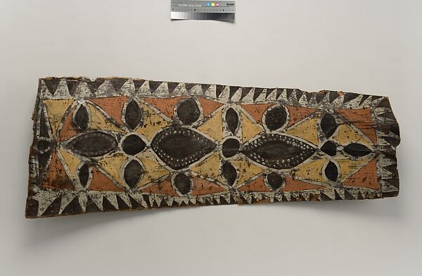 This panel is one of over 270 original paintings commissioned from Kwoma artists in the village of Mariwai in 1970 and 1973 by Douglas Newton, the first curator of Oceanic art in the Department of the Arts of Africa, Oceania and the Americas. Once completed, they were shipped to New York and installed in the galleries. In 2007, when the Oceania galleries at the Metropolitan Museum were renovated, the panels were attached to a new superstructure. Although less steeply pitched than the Kwoma houses found in villages today, the installation evokes the essential form of a ceremonial house ceiling. Together these suspended panels form an impressive and spectacular installation in the Metropolitan Museum which, at 80.4 feet (24.5 meters) end-to-end, is the largest contemporary art installation in the museum.