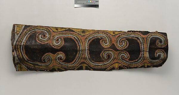 This panel is one of over 270 original paintings commissioned from Kwoma artists in the village of Mariwai in 1970 and 1973 by Douglas Newton, the first curator of Oceanic art in the Department of the Arts of Africa, Oceania and the Americas. Once completed, they were shipped to New York and installed in the galleries. In 2007, when the Oceania galleries at the Metropolitan Museum were renovated, the panels were attached to a new superstructure. Although less steeply pitched than the Kwoma houses found in villages today, the installation evokes the essential form of a ceremonial house ceiling. Together these suspended panels form an impressive and spectacular installation in the Metropolitan Museum which, at 80.4 feet (24.5 meters) end-to-end, is the largest contemporary art installation in the museum.