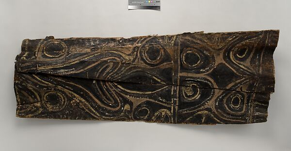 This panel is one of over 270 original paintings commissioned from Kwoma artists in the village of Mariwai in 1970 and 1973 by Douglas Newton, the first curator of Oceanic art in the Department of the Arts of Africa, Oceania and the Americas. Once completed, they were shipped to New York and installed in the galleries. In 2007, when the Oceania galleries at the Metropolitan Museum were renovated, the panels were attached to a new superstructure. Although less steeply pitched than the Kwoma houses found in villages today, the installation evokes the essential form of a ceremonial house ceiling. Together these suspended panels form an impressive and spectacular installation in the Metropolitan Museum which, at 80.4 feet (24.5 meters) end-to-end, is the largest contemporary art installation in the museum.