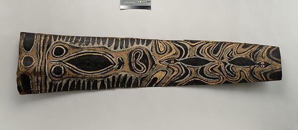 This panel is one of over 270 original paintings commissioned from Kwoma artists in the village of Mariwai in 1970 and 1973 by Douglas Newton, the first curator of Oceanic art in the Department of the Arts of Africa, Oceania and the Americas. Once completed, they were shipped to New York and installed in the galleries. In 2007, when the Oceania galleries at the Metropolitan Museum were renovated, the panels were attached to a new superstructure. Although less steeply pitched than the Kwoma houses found in villages today, the installation evokes the essential form of a ceremonial house ceiling. Together these suspended panels form an impressive and spectacular installation in the Metropolitan Museum which, at 80.4 feet (24.5 meters) end-to-end, is the largest contemporary art installation in the museum.