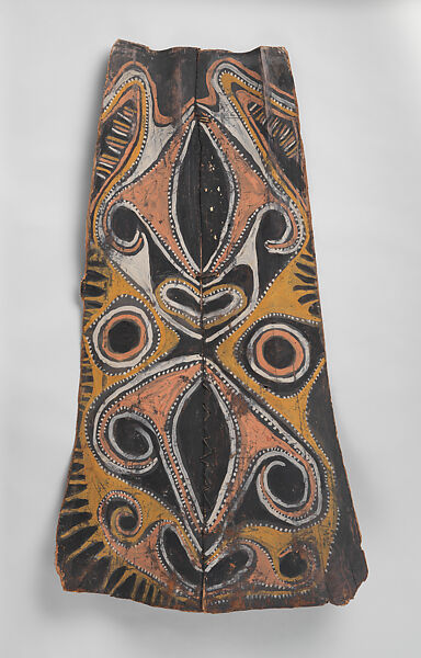 This panel is one of over 270 original paintings commissioned from Kwoma artists in the village of Mariwai in 1970 and 1973 by Douglas Newton, the first curator of Oceanic art in the Department of the Arts of Africa, Oceania and the Americas. Once completed, they were shipped to New York and installed in the galleries. In 2007, when the Oceania galleries at the Metropolitan Museum were renovated, the panels were attached to a new superstructure. Although less steeply pitched than the Kwoma houses found in villages today, the installation evokes the essential form of a ceremonial house ceiling. Together these suspended panels form an impressive and spectacular installation in the Metropolitan Museum which, at 80.4 feet (24.5 meters) end-to-end, is the largest contemporary art installation in the museum.