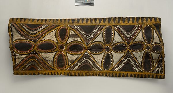 This panel is one of over 270 original paintings commissioned from Kwoma artists in the village of Mariwai in 1970 and 1973 by Douglas Newton, the first curator of Oceanic art in the Department of the Arts of Africa, Oceania and the Americas. Once completed, they were shipped to New York and installed in the galleries. In 2007, when the Oceania galleries at the Metropolitan Museum were renovated, the panels were attached to a new superstructure. Although less steeply pitched than the Kwoma houses found in villages today, the installation evokes the essential form of a ceremonial house ceiling. Together these suspended panels form an impressive and spectacular installation in the Metropolitan Museum which, at 80.4 feet (24.5 meters) end-to-end, is the largest contemporary art installation in the museum.