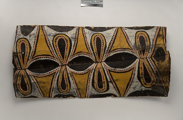 This panel is one of over 270 original paintings commissioned from Kwoma artists in the village of Mariwai in 1970 and 1973 by Douglas Newton, the first curator of Oceanic art in the Department of the Arts of Africa, Oceania and the Americas. Once completed, they were shipped to New York and installed in the galleries. In 2007, when the Oceania galleries at the Metropolitan Museum were renovated, the panels were attached to a new superstructure. Although less steeply pitched than the Kwoma houses found in villages today, the installation evokes the essential form of a ceremonial house ceiling. Together these suspended panels form an impressive and spectacular installation in the Metropolitan Museum which, at 80.4 feet (24.5 meters) end-to-end, is the largest contemporary art installation in the museum.