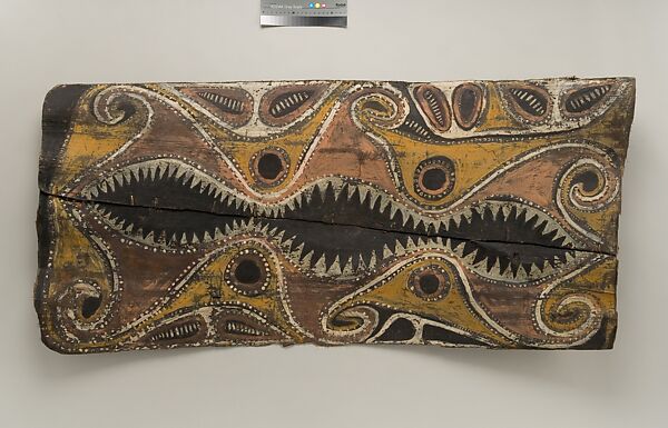 This panel is one of over 270 original paintings commissioned from Kwoma artists in the village of Mariwai in 1970 and 1973 by Douglas Newton, the first curator of Oceanic art in the Department of the Arts of Africa, Oceania and the Americas. Once completed, they were shipped to New York and installed in the galleries. In 2007, when the Oceania galleries at the Metropolitan Museum were renovated, the panels were attached to a new superstructure. Although less steeply pitched than the Kwoma houses found in villages today, the installation evokes the essential form of a ceremonial house ceiling. Together these suspended panels form an impressive and spectacular installation in the Metropolitan Museum which, at 80.4 feet (24.5 meters) end-to-end, is the largest contemporary art installation in the museum.