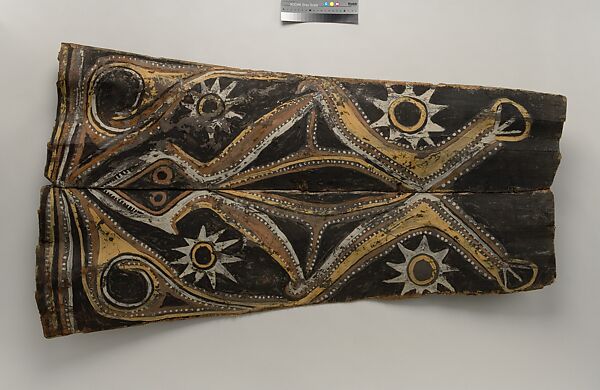 This panel is one of over 270 original paintings commissioned from Kwoma artists in the village of Mariwai in 1970 and 1973 by Douglas Newton, the first curator of Oceanic art in the Department of the Arts of Africa, Oceania and the Americas. Once completed, they were shipped to New York and installed in the galleries. In 2007, when the Oceania galleries at the Metropolitan Museum were renovated, the panels were attached to a new superstructure. Although less steeply pitched than the Kwoma houses found in villages today, the installation evokes the essential form of a ceremonial house ceiling. Together these suspended panels form an impressive and spectacular installation in the Metropolitan Museum which, at 80.4 feet (24.5 meters) end-to-end, is the largest contemporary art installation in the museum.