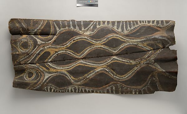 This panel is one of over 270 original paintings commissioned from Kwoma artists in the village of Mariwai in 1970 and 1973 by Douglas Newton, the first curator of Oceanic art in the Department of the Arts of Africa, Oceania and the Americas. Once completed, they were shipped to New York and installed in the galleries. In 2007, when the Oceania galleries at the Metropolitan Museum were renovated, the panels were attached to a new superstructure. Although less steeply pitched than the Kwoma houses found in villages today, the installation evokes the essential form of a ceremonial house ceiling. Together these suspended panels form an impressive and spectacular installation in the Metropolitan Museum which, at 80.4 feet (24.5 meters) end-to-end, is the largest contemporary art installation in the museum.