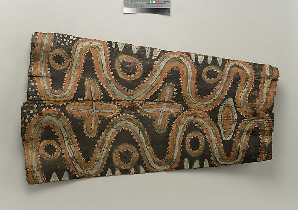 This panel is one of over 270 original paintings commissioned from Kwoma artists in the village of Mariwai in 1970 and 1973 by Douglas Newton, the first curator of Oceanic art in the Department of the Arts of Africa, Oceania and the Americas. Once completed, they were shipped to New York and installed in the galleries. In 2007, when the Oceania galleries at the Metropolitan Museum were renovated, the panels were attached to a new superstructure. Although less steeply pitched than the Kwoma houses found in villages today, the installation evokes the essential form of a ceremonial house ceiling. Together these suspended panels form an impressive and spectacular installation in the Metropolitan Museum which, at 80.4 feet (24.5 meters) end-to-end, is the largest contemporary art installation in the museum.