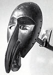 Dan masks have been documented as the embodiment of at least a dozen artistic personalities. Among these are Deangle, who ventures into the village from the initiation camps to ask women for food; Tankagle and Bagle, who entertain through a range of aesthetically pleasing dances, skits, and mimes; Gunyege, whose mask is worn by a community's champion foot racers in competitions; and Bugle, who historically leads men into battle. This example, with its bird-like beak and oval eyes is known as Ge Gon. Originally educational, historical, and regulartory, it was described as a mask of wisdom. It has progressively become mostly an entertaining mask, that appeals through its bird-like movements in performance.