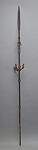 This Bamana staff, or ceremonial spear, while fabricated in the nineteenth or twentieth century, is a good example of the type of objects produced by blacksmiths as early as the fourteenth century. Bamana staffs are almost always figural and though they may possess sacred names, publicly they are simply called "iron women." They are often carried by those who have purchased an important village title, or are of high rank. They may also be commissioned by members of either the Jo or Gwan initiation associations, to be placed in the ground around altars in the sacred groves or in shrine houses. Among the Mande, similar staffs are presented to young men at the conclusion of their initiations and as part of circumcision rituals. As spears were the primary weapons used for both war and hunting before the introduction of guns, they continue to be considered an important symbol of manhood. Staffs often receive offerings of millet, water, or beer, which are poured over the works during ceremonies. This can lead to the heavy rusting found on even relatively recent examples.