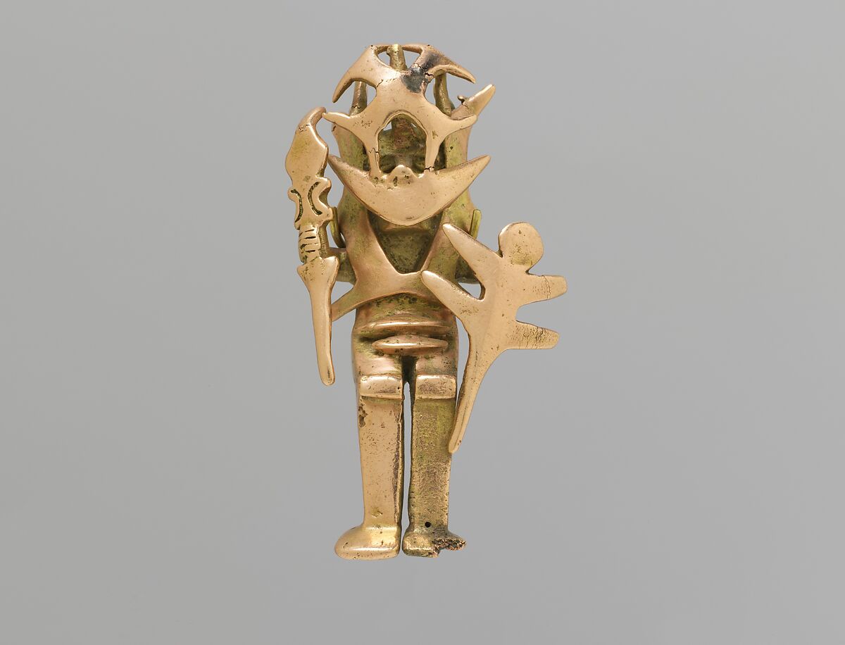 In the earliest metallurgical traditions of the ancient Americas, specifically in South America, gold was first hammered into a sheet and then shaped, cut, and sometimes decorated with repoussé designs. Later traditions, developed in the Quimbaya region of Colombia during the first centuries CE, employed a casting technique known as lost wax. This technology subsequently spread to other parts of Colombia, Panama and Costa Rica. Although some themes and styles are shared across this vast territory, specific styles emerged in each region through time. Small but extremely intricate body adornments were the preferred products of gold working in this area. Some of these objects were worn by high-status individuals in their lifetime before they were deposited in burials; others appear to have been made expressly for the tomb.