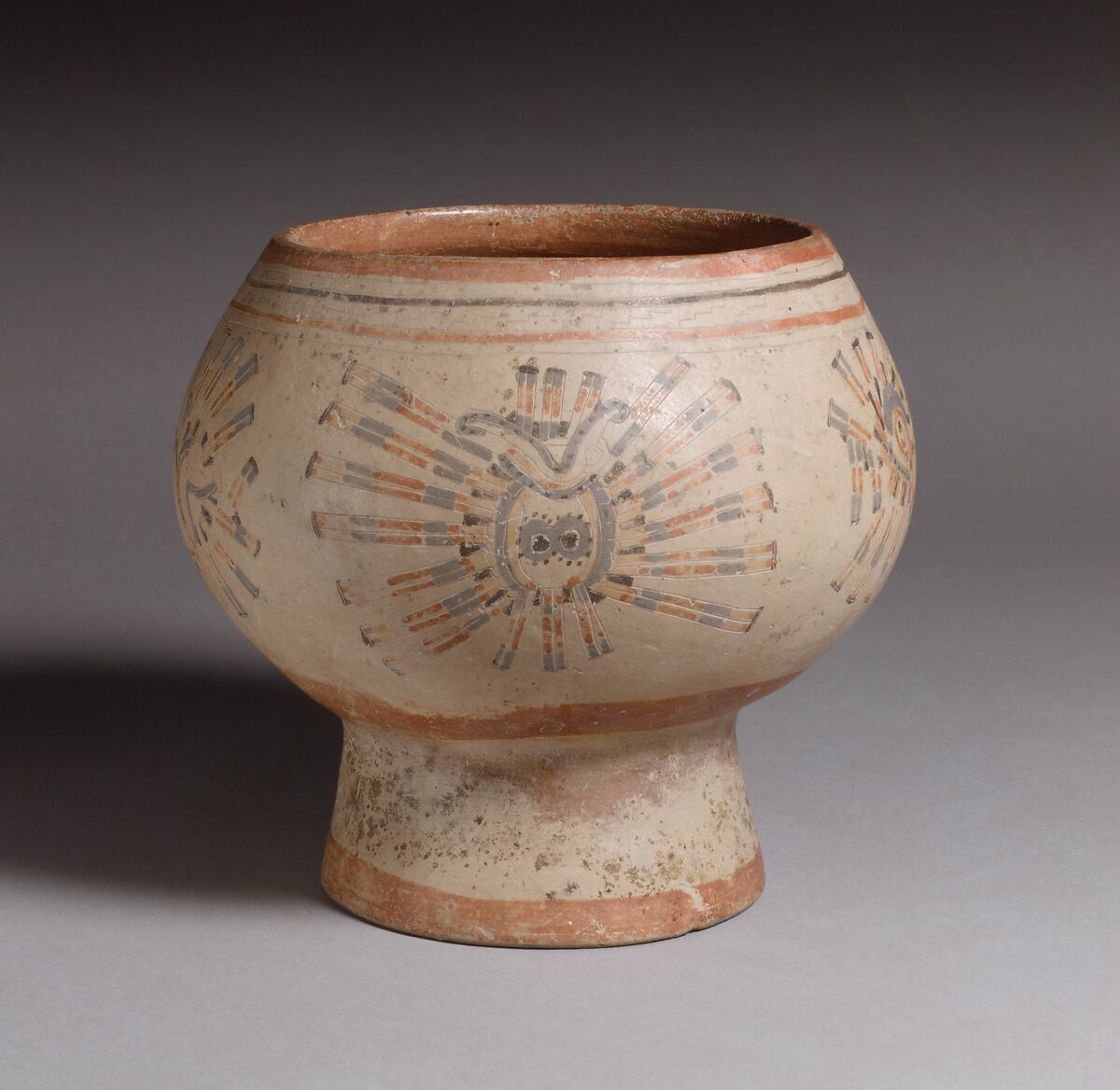 During the last few centuries prior to the Spanish conquest, numerous ceramic styles were produced in the Greater Nicoya region of Costa Rica that were strongly inspired in form and decoration by ceramic traditions in the Maya area and central Mexico. One of those styles, known as Vallejo, emphasizes white-slipped surfaces with polychrome designs outlined by incision, as seen on this pedestal bowl. The motifs decorating the outside of the vessel recall the geometric, brightly colored painting style—known as Mixteca-Puebla—popular in central Mexico at the time. Elements of the style and the religious concepts associated with it spread throughout Mesoamerica and northern Central America, probably by means of an exchange network of elite goods and perhaps even an influx of migrating Nahua-speaking peoples from northern Mexico. Local ceramic artists formulated their own interpretation of the foreign imagery and created a blend of figures and symbols that only vaguely resembles a Mesoamerican original. Two of the motifs, shown on opposite sides of the bowl, represent a version of the Mexican earth monster, a fanged, toadlike deity known as Tlaltecuhtli, believed to swallow human sacrifices and the heavenly bodies on their daily journey through the sky. Only the open profile mouth of the creature and one eye are recognizable as animal features. The figure's body and what are usually clawed hands and feet are abstract shapes. The second image on the vessel is that of the Feathered Serpent, also known as Quetzalcoátl. This ancient deity had numerous aspects and was worshipped by many Mesoamerican peoples. The snake's long body forms a U-shape ending in a sweeping curl; its profile head has a wide open maw with streamers emerging from it, symbolizing the split tongue and fangs. The feathers, an essential feature on Quetzalcoátl representations, are depicted as long, rectangular projections from the head and tail end.