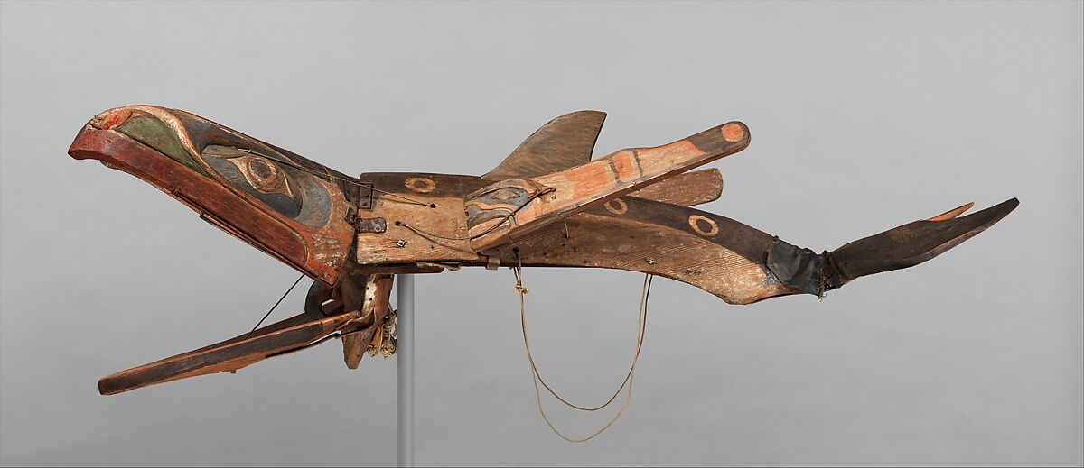 The impressive whale masks of the Kwakwaka’wakw peoples are grand constructions in which the mouth, fins, and tail of a sea mammal are made to move in imitation of a whale swimming. The tail goes up and down, the lateral flippers move in and out, and the great mouth opens. The dorsal fin also moves slightly. The entire mechanism is rigged in such a way that the performer, while carrying the mask on back and shoulders, can manipulate it with his hands much like a puppet and mimic the gestures of a swimming whale. When actively performing, a costume of shredded bark hangs from the mask, hiding the body of the wearer. This example is an unusual type called a transformation mask, in which one creature opens to reveal another. In the whale’s mouth is a large, hook-nosed face, which may be that of the ancestor who interacted with a whale in the mythic past, thereby making the whale the emblem of the family lineage.