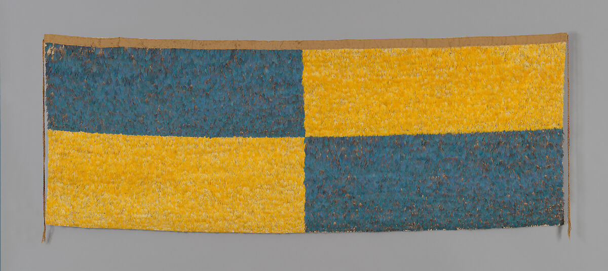 The panels are of roughly similar dimensions, and the majority feature alternating rectangles of blue and yellow feathers, which came from the macaw’s dorsal and ventral sides, respectively. The panels have a woven heading tape, and most also include braided cords that hang from the narrow sides. Although the cords suggest that these works were meant to be secured to some kind of structure, their actual function remains frustratingly elusive.