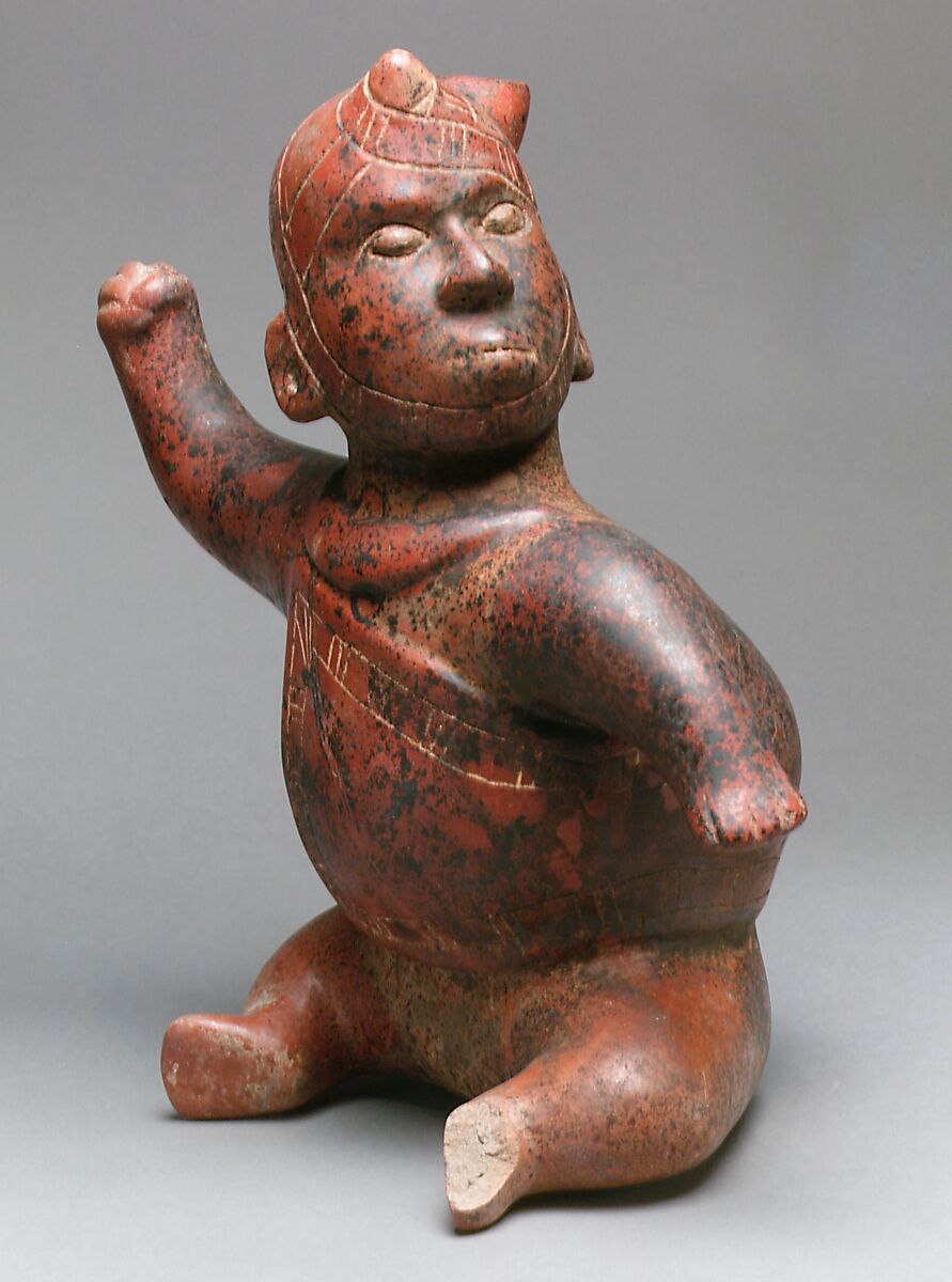 The sculpture of Colima is as stytistically distinctive as that of the neighboring regions of Jalisco and Nayarit. Round, smooth forms with little variation in the warm red-brown surface color characterize Colima work. The wide array of postures and expressions often make the sculptures particularly pleasing to modern tastes. Seated male figures that have a horn strapped to their heads, as here, were a favored depiction. The strapped horn has recently been interpreted as a stylized conch shell, meaningful because of its relation to rulership. The horned figures, however, have also been interpreted as warriors or shamans (ritual specialists). Conjecture might suggest that the figure, with its twisting, dramatic pose, pugnacious expression, and upraised right hand clenched in a fist, was protecting the tomb into which it had been placed as a guardian.