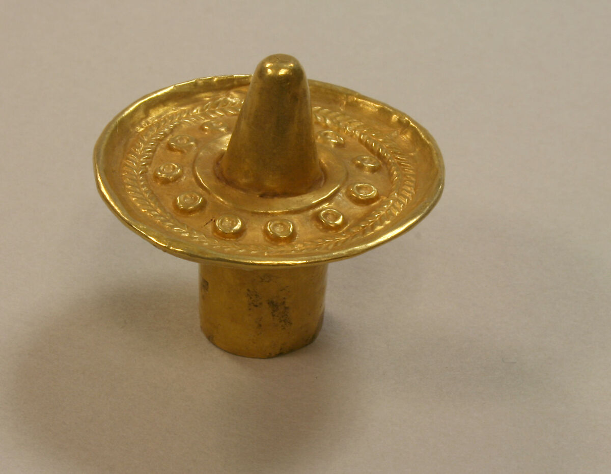 Other similar ear spools have been recovered from Tomb 6 at El Caño, a funerary and ritual complex that is 2.5 km to the north of Sitio Conte, associated with individual 1 and in a context dated to cal. A.D. 775–790 / 800-980 [calibrated] (Mayo and Mayo 2017) (see Image 7). These were recovered not directly with human remains but in a packet of materials; at least seven were recovered with the two separate halves joined by fitting one cylindrical end into the slightly wider cylindrical end of the other. This fitting would have been possible with the two halves discussed here; the diameter of the cylindrical end of one is 1.5 cm and that of the other is 1.4 cm. The ear spools from El Caño show a similar fabrication process involving three pieces as well as similar geometric motifs, but instead of circles often include triangular motifs that follow the circumference of the piece with hammered decoration. In some cases, there is a fourth piece associated with these ear spool halves—a flat, cut-out sheet with triangular elements—that would have attached to the piece surrounding the conical center. There are other forms of ear ornaments from El Caño, including tubes of greenstone with covers on their ends made of metal sheet as well as long metal tubes with ornate finials whose motifs recall those of the ear spools described here, typically with a projection at the center.