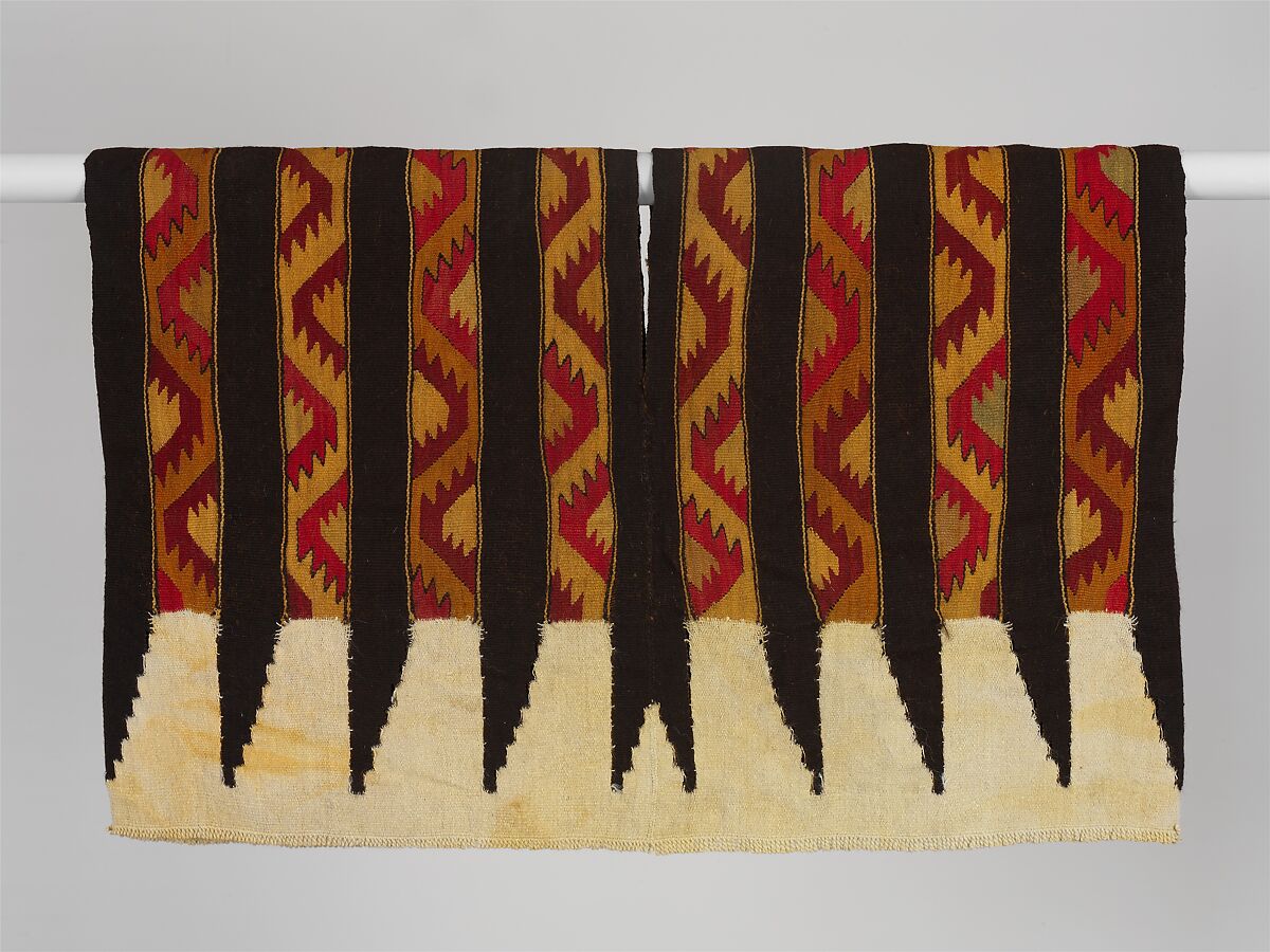 Tunics, known as uncu in the language of the Incas (an ancestor of the present-day Quechua language), were the primary element of men’s attire in the Andes, and were worn over a simple loincloth. Tunics of this style have been found on the central coast of Peru but their technical features indicate that they are clearly a highland product. Contact between the highlands and the coast was common during the Inca empire, and this type of tunic probably dates from that time. Presumably, they originate from a highland area adjacent to the central coast. The construction of the tunic is peculiar, and its visual effect can be compared to that of the coastal imitations of this highland style. The exclusive use of camelid hair is another highland feature. Made of two loom pieces sewn together, the structure is a combination of discontinuous, dovetailed warps and discontinuous weft in the lower section and tapestry and weft-faced faced plain stripes in the upper section. The jagged patterns surely would have had to have been darned with a needle rather than woven. The fringe was created by twisting yarn bunches from the white section.