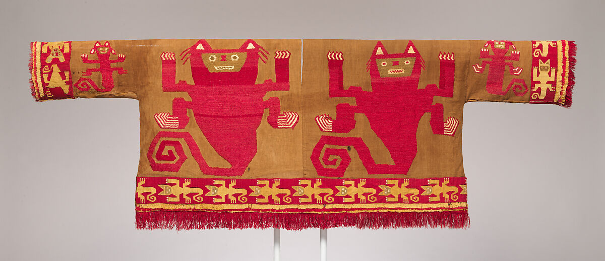 The tan, red, and yellow colors along with the subject matter—ferocious cats—suggest that this shirt was made in a later period of Chimú weaving, perhaps just after the Kingdom of Chimor fell to Inca forces in the late 15th century. The theme of menacing felines, with their prominent claws, pointed ears, and curled tails, is less common than maritime subjects in Chimú textiles. Felines are often considered a symbol of political power in the ancient Americas, and the repetition of felines in a rampant or threatening position may have served an apotropaic function, that is, it may have been thought to have protective qualities.