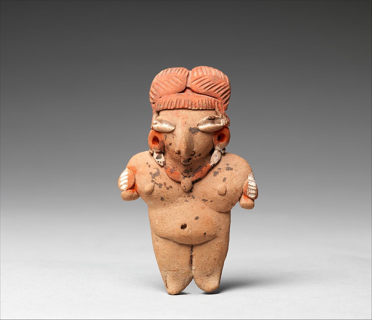 This ceramic figurine features a stylized female, nude except for a beaded necklace and rounded earflares, a nose ornament, arm ornaments, and an elaborate coiffure. Hand-modeled, figurines of this type are often female and come in a variety of styles displaying regional characteristics such as the coffee-bean eyes typical of figurines from Chupícuaro. Potters emphasized the faces and heads of these figures while often minimally indicating the bodies, yet it was important to gender the figurines as female by indicating the genitalia. Small ceramic figurines were made by most ancient peoples in Mesoamerica from as early as the second millennium BCE to the time of the Aztec in the early sixteenth century. They were placed as funerary offerings in burials or in other dedicatory assemblages. Some link the figurines to fertility cults; others view them as companions for the deceased.