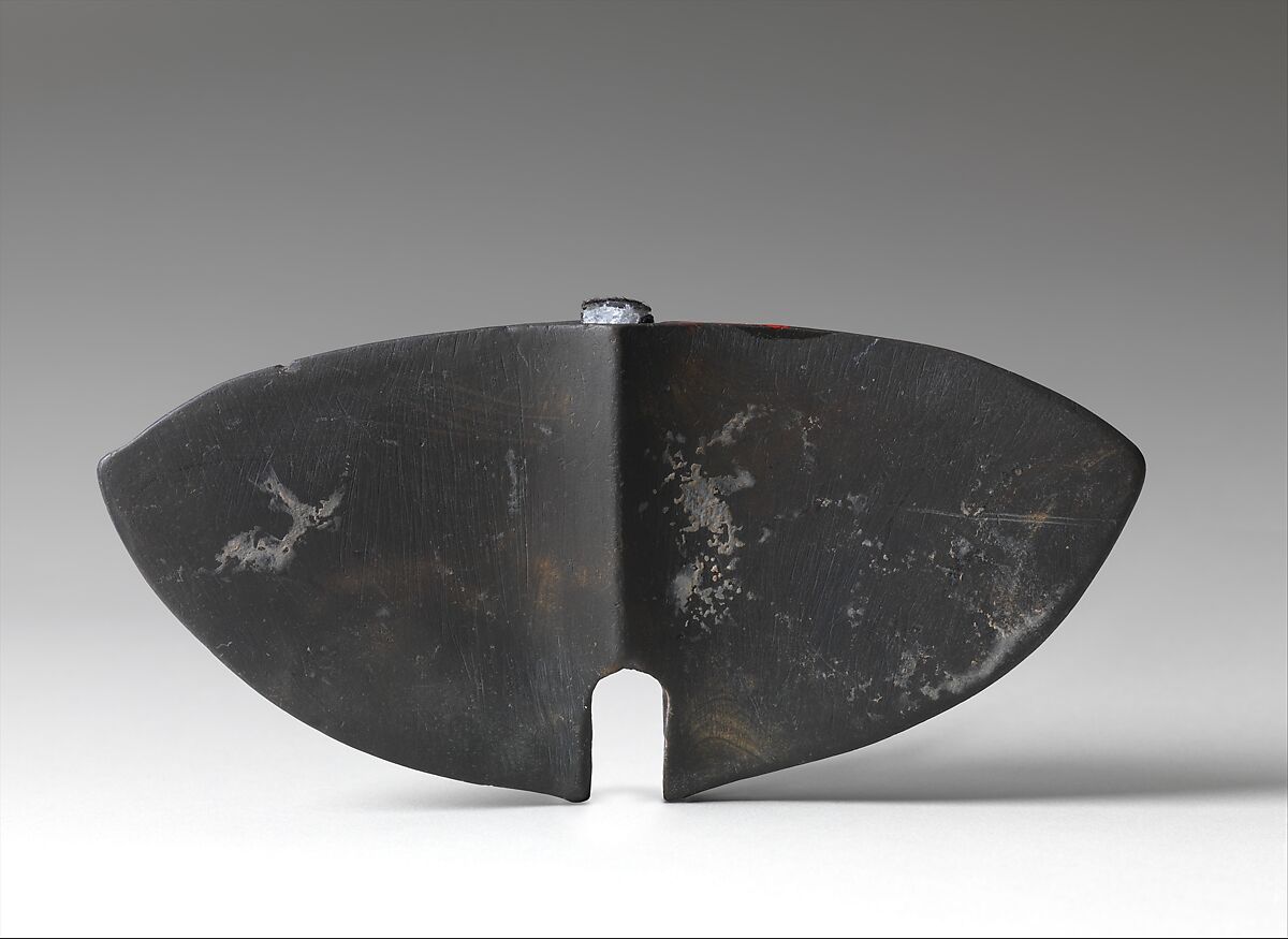 The matte greenish black phyllite stone of this Single-Notched Butterfly bannerstone has fine, barely perceptible dark banding and cloudy off-white inclusions that would have drawn the attention of an Archaic sculpture who carved the symmetrical flanges into thin wings that are slightly bowed. The sculptor accentuated the center with a pointed ridge parallel to where they drilled a hole for hafting onto a shaft. The flanges of this bannerstone are exceedingly thin and difficult to achieve, testament to the experience and aesthetic sensibility of the sculptor. There are chips along the edges and perforation, signs of use in the Archaic period. On the inner side of the notch 1979.206.1129, the Museum’s accession number, is written in red. On one side of the stone Tiffin, Ohio is written in white, referring to a city in Seneca County where this bannerstone was presumably found and first collected in the 19th or early 20th century.