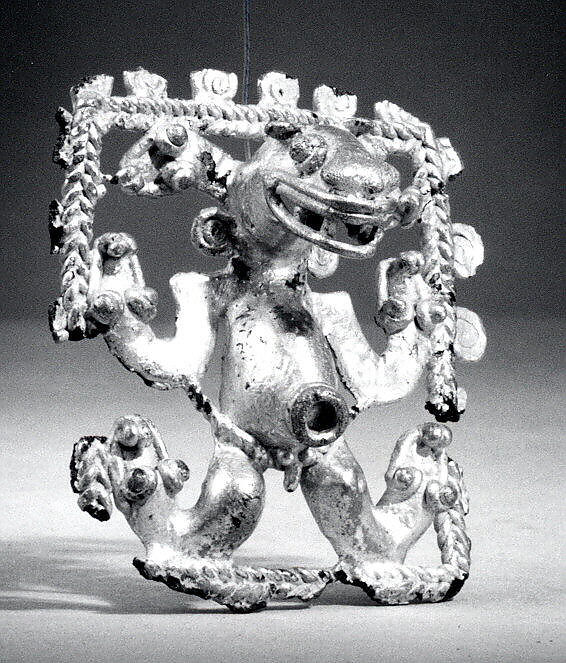 This pendant is an anthropomorphic jaguar with serpents sprouting from its heads and limbs, surrounded by a braided frame. Composite creatures consisting of human figures with pronounced animal features occur throughout Costa Rica, signaling that beliefs and their expressions were shared by many groups. Local styles developed distinctive characteristics, however. Metalwork from the Diquis Delta area in southwestern Costa Rica is ornate and replete with detail. Spirals and twisted and braided rope proliferate, and danglers, tinkling like bells and glittering in the sunlight, sometimes conceal the figures behind them.