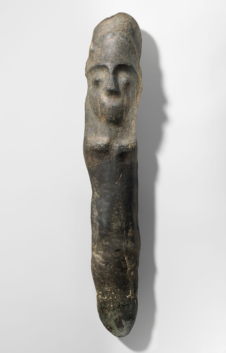 This stone, axe handle-shaped figure may have been a ceremonial scepter created by Taíno peoples, the diverse societies that inhabited the Antilles archipelago before European contact. The most numerous category of polished stone sculpture emerging from the Taíno world of the ancestral Caribbean islands are ceremonial axes and blades, which take many forms and may have been an important medium of exchange. Axes feature abstract zoomorphic forms in stone, or consisted of wooden handles with stone blades hafted to them. Ceremonial blades made of different types of greenstone, both local and imported, have been recovered in large numbers. These axes, known as petaloid celts for their resemblance to flower petals, could have served as dedicatory offerings, which have a long history on the Caribbean mainland in Mesoamerica.